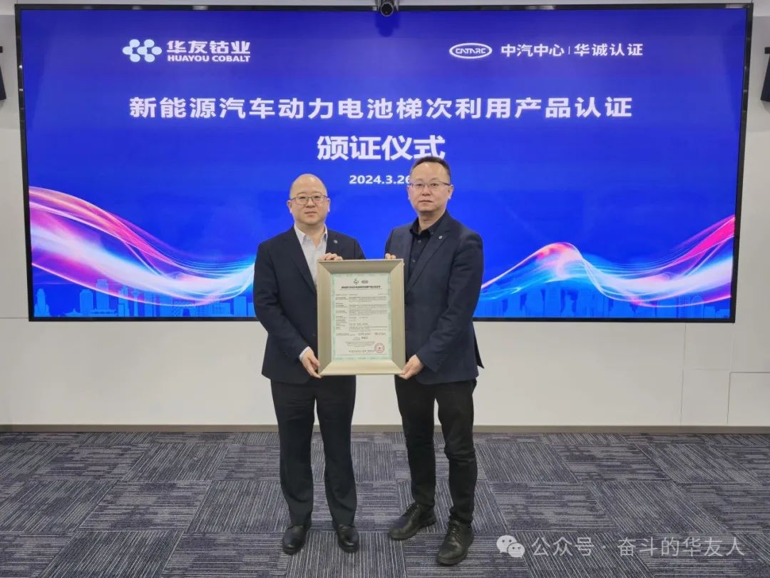 On 26th March, the certification ceremony of power battery recycling products for new energy vehicles was held in Tianjin. Jiangsu Huayou Energy Technology Co., Ltd. (hereinafter referred to as "Jiangsu Huayou Energy") was awarded the first domestic product certificate for the secondary utilisation of power batteries for new energy vehicles, marking the formal implementation of the product certification system for the secondary utilisation of power batteries for new energy vehicles in China and fully demonstrating the positive role of quality certification in guaranteeing product quality and safety, and serving economic and social development. The positive role of quality certification to ensure product quality and safety and serve economic and social development. It is 5KWh emergency power supply EPS (43.8V117Ah-5KWh) that passed the certification, marking that the safety and reliability of Jiangsu Huayou Energy's products for secondary utilisation meet the certification standards at the production end and the use end.