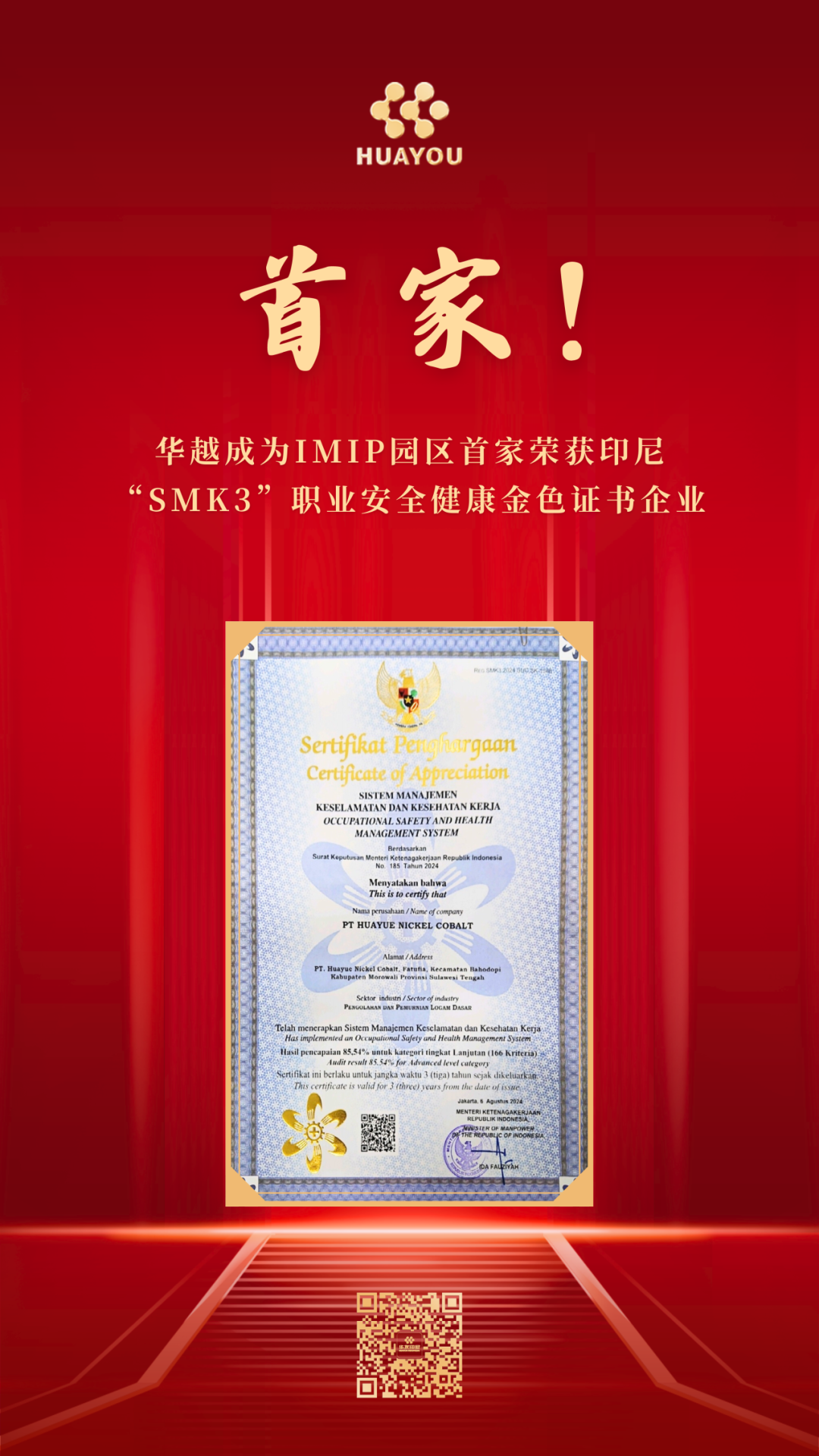 On 9th September, Huayue Nickel & Cobalt (Indonesia) Sdn Bhd passed the audit and obtained the Gold (highest level) SMK3 Occupational Safety and Health Certificate issued by the Ministry of Labour of Indonesia, becoming the first enterprise among more than 50 enterprises in IMIP Park to obtain this certification.